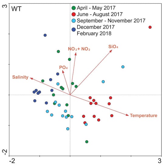 Concerning the relationship between all samples in WT and the corresponding environmental variables, overall, five environmental variables were included in the CCA analysis according to their P-values. The ordination plot produced explained 54.9% of the variance of samples—environmental variables. The first axis (x-axis) was positively related to water temperature and SiO4 and negatively related to salinity and the second axis (y-axis) was positively related to all of the included environmental variables (mainly NO3− + NO2−) except for water temperature. According to the ordination results almost all samples of June–August 2017 were ordinated with a strong positive relation to the water temperature and SiO4 (Figure 5). The majority of the samples of April–May 2017 were positively related to the included dissolved nutrients and in particular NO3− + NO2− and PO4. Regarding the samples of autumn and winter (September–November 2017 and December 2017–February 2018), these were positively related to salinity but negatively to water temperature (Figure 5). Apart from the separate ordination plots for each sampling site, an overall ordination plot was produced including all samples, which corroborates these results (see Supplementary Figure S5). The nutrients included in all plots did not show any strong and consistent relations among sites.