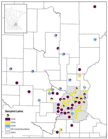 Eurasian and hybrid watermilfoil commonly co-occurred in our lakes, as they did in the Michigan and Indiana lakes studied by Sturtevant et al. [28]. In contrast Moody and Les [6] did not find the co-occurrence of Eurasian and hybrid watermilfoil in Minnesota, although they did in two Wisconsin lakes and one in Idaho. Very few (seven) lakes in our survey contained both northern and hybrid watermilfoil, partly as a result of their occurrences being more common in different regions of the state. Hybrid watermilfoil may be less commonly occurring with northern because northern may be outcompeted by invasive Eurasian (or hybrid) over time [46] or because northern may be eliminated by repeated herbicide treatments to control invasive watermilfoil. Reduced presence of northern watermilfoil has been found in previous studies [6,28] and warrants further investigation as the spread of hybrids increases. Northern watermilfoil likely had a greater presence in the Metro area than it currently does, but populations are decreasing through either competition, genomic contamination [6], or the use of herbicides [47].