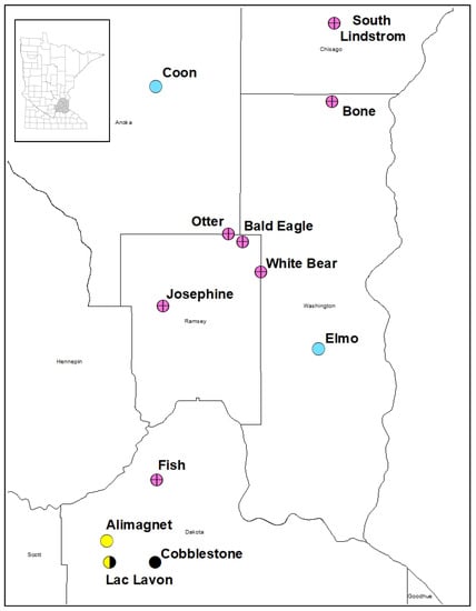 - State of Minnesota, Department of Natural Resources. Invasive Species Program. In Invasive Species of Aquatic Plants and Wild Animals in MN: Annual Report for 2017; MN Department of Natural Resources: St. Paul, MN, USA, 2017. [Google Scholar]