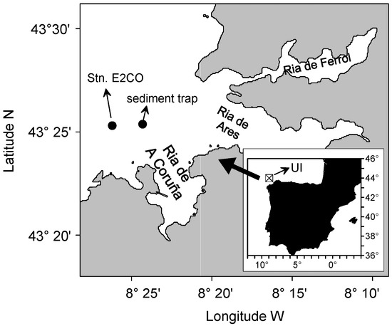 Samples of water, seston and plankton were collected approximately at a monthly frequency in 2010 and 2011 at St. E2CO (80 m depth) off A Coruña (Figure 1). This station is part of the observational time series project RADIALES of the Instituto Español de Oceanografía (http://www.seriestemporales-ieo.com/) and was sampled uninterruptedly since 1989. Water samples at 0, 5, 10, 20, 30, 40 and 70 m were obtained by the deployment of a CTD-rosette equipped with Niskin bottles. Aliquots were employed for determination of dissolved nutrients, chlorophyll, phytoplankton species composition, and natural abundance of seston stable nitrogen and carbon isotopes. Dissolved nutrients included total nitrate (nitrate plus nitrite), phosphate, and ammonium, and were determined by segmented-flow analysis (Bran-Luebbe). Chlorophyll a (Chla) was determined in 90% acetone extracts by fluorometry after filtration of 200 mL of water through GF/F filters. Total diatom abundance (cells L−1) was determined in 50 to 100 mL aliquots preserved in Lugol’s solution by the Utermöhl technique. Seston was collected by vacuum filtration of up to 1 L of water through GF/F filters and stored frozen (−20 °C). Temperature and salinity profiles were obtained with a SeaBird SBE-25 CTD. Details on the analytical methods, plankton species composition and biomass, and environmental conditions at this station can be found elsewhere [19,20,21].