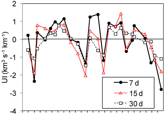 The upwelling index (UI, km3 s−1 km−1) averaged over periods of 7, 15, and 30 days prior to each sampling date at St. E2CO.
