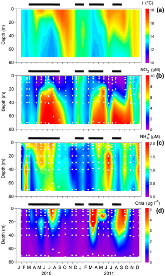 Vertical variability of (a) temperature (t, °C), (b) nitrate (NO3-, µM), (c) ammonium (NH4+, µM), and (d) chlorophyll-a (Chla, µg l-1) during the study. The horizontal lines above each panel indicate the upwelling periods (UI15 ≥ 0). The white dots represent the water sampling depths. Interpolations were made using Kriging.