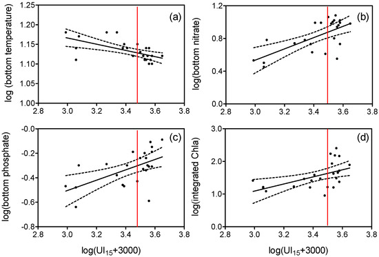 Relationships between log-transformed bottom (a) temperature (°C), (b) nitrate (µM), (c) phosphate (µM), and (d) 50 m-depth integrated chlorophyll a (mg Chla m−2) and upwelling index (UI15) averaged over 15 d prior to sampling (m3 s−1 km−1). Significant (P < 0.05) regression lines (continuous lines) and 95% confidence limits (dashed lines) are indicated. The red line indicates UI15 = 0. Bottom waters correspond to the deepest (70 m) sample.