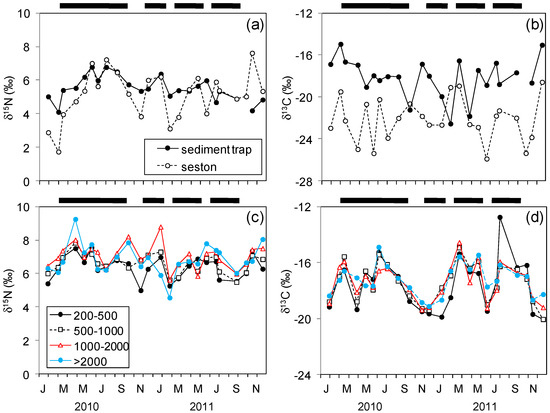 Variability of δ15N and δ13C (‰) in seston or sediment trap collected particles (a,b), and four plankton size-fractions (in µm, c,d) during the study. The horizontal lines above each panel indicate the upwelling periods (UI15 ≥ 0). Values of δ13C in plankton size-fractions were corrected for lipids (see Methods).
