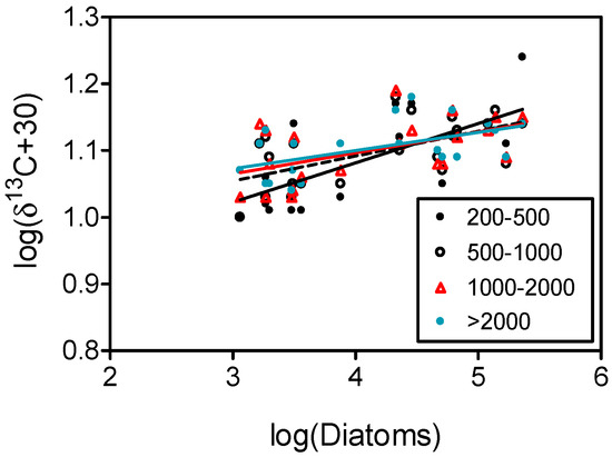 Relationships between log-transformed δ13C of plankton size-fractions (µm) and the mean abundance of diatoms in the upper 50 m. Significant (P < 0.05) regression lines are indicated. Confidence limits for regression lines were omitted for clarity. Values of δ13C in plankton size-fractions were corrected for lipids (see Methods).
