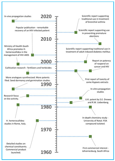 The timeline (1960–2020) of research and commercial use of Hypoxis hemerocallidea.