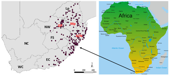Distribution of Hypoxis hemerocallidea in South Africa, showing no records in Northern (NC) and Western Cape (WC) Provinces (Source: South African National Biodiversity Institute; SANBI). Provinces: WC: Western Cape; NC: Northern Cape; EC: Eastern Cape; FS: Free State; NW: North West; GP: Gauteng; KZN: KwaZulu-Natal; Mp: Mpumalanga; Lp: Limpopo.