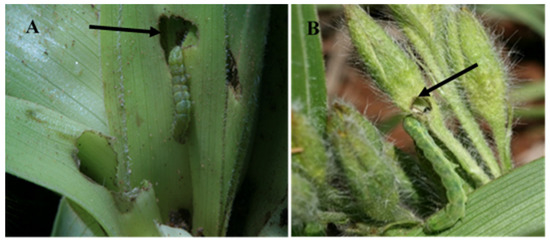 A potential pest and its potential damage on Hypoxis hemerocallidea plants. (A) African bollworm (Helicoverpa armigera) feeding on the leaves and (B) on the seed pods (Source: Agricultural Research Council-Vegetable and Ornamental Plant Research Station).