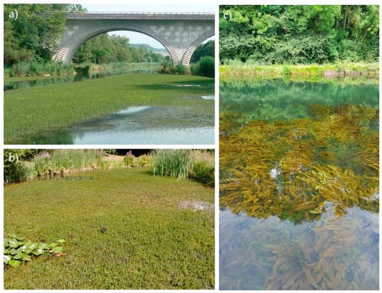 Systems invaded by Myriophyllum heterophyllum. (a,c) navigation channels in Northeast France (Photos C. Pestelard); (b) pond on the campus of Düsseldorf University, Germany (Photo A. Hussner).