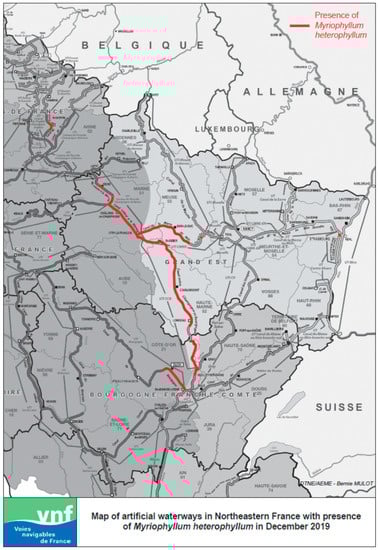 Alien Myriophyllum heterophyllum Michx., 1803 (Haloragaceae) is becoming a species of extreme concern within some European countries, as it is currently spreading very fast, particularly in artificial waterways (channels), such as in Northeast France (Figure 1). Hussner (2012) described it in six European countries (Austria, Belgium, France, Germany, the Netherlands and Spain) [1]. By that time, the species was only on the Alert List of the European and Mediterranean Plant Protection Organization (EPPO), but has moved up to A2 level in 2015 after a comprehensive pest risk assessment (PRA) of the species was conducted [2]. A2 level lists species locally present in the EPPO region and recommended for regulation as quarantine pests by EPPO member countries [3]. The EU Regulation 1143/2014 on the prevention and management of the introduction and spread of invasive alien species [4] outlines that all member states should “prevent the introduction of, control or eradicate those alien species which threaten ecosystems, habitats or species”. It is listing 66 invasive alien species of EU concern, including M. heterophyllum since 2017 [5].