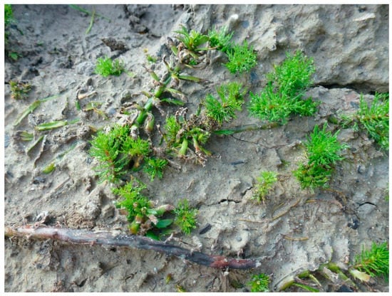 A terrestrial form of the plants can develop when stands of this species dry out. This was observed by Manuel (1973), cited in [6], who described that terrestrial plants had small shoots of maximum 10 cm height, with strongly cutinized leaves. Clumped plant remains left along the shoreline after management can survive in a terrestrial form [2,43] (Figure 4). It is currently unclear if these terrestrial forms can contribute to the spread of the species, but they are certainly able to regain vigorous growth when again being submerged in water.