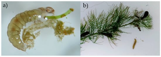 Aquatic insect herbivores found on Myriophyllum spp. from waterways in Northeast France. (a) Acentria ephemerella found on M. heterophyllum from the Canal between the Marne and the Rhine, Branch West. (b) Parapoynx stratiotata found on M. verticillatum from the Ardennes Canal. Both species are aquatic moth larvae and belong to the Crambidae. Photos E. Gross.