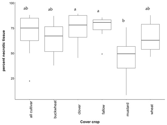 Percent necrotic tissue of grapevines growing in soil conditioned by cultivar cover crops. Treatments include a mixture of all plants (“all cultivar”), buckwheat (“buckwheat”), crimson clover (“clover”), uninoculated fallow (“fallow”), white mustard (“mustard”), and wheatgrass (“wheat”). Boxplots show the first and third quartile, median (middle line), range (whiskers), and circles (outliers). Letters represent statistical significance at p < 0.05. This section may be divided by subheadings and should provide a concise and precise depiction of the experimental results, their interpretation, and the experimental conclusions that can be drawn.