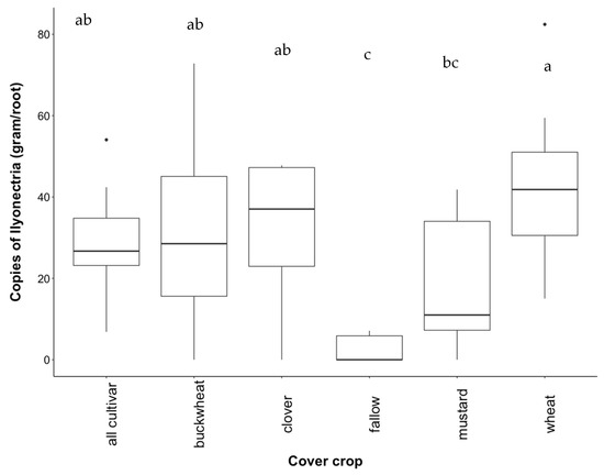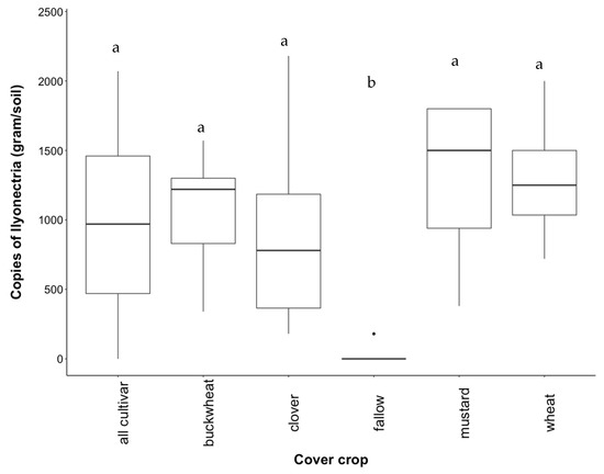 Recovery of I. liriodendri DNA from soil conditioned by cultivar cover crops. Treatments are a mixture of all plants (“all cultivar”), buckwheat (“buckwheat”), crimson clover (“clover”), uninoculated fallow (“fallow”), white mustard (“mustard”), and wheatgrass (“wheat”). Letters above boxplots represent statistical significance at p < 0.05.