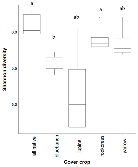 Regarding pairwise interactions between treatments, alpha diversity was significantly higher under rockcress compared to bluebunch wheatgrass. Brassicaceous crops can inhibit fungal activity due to hydrolysis products of the glucosinolates they produce [115]; however, this is often limited to fungal pathogens [97], and is not widely observed in symbiotic fungi [116,117]. The fact that fungal diversity under rockcress was comparable to that of white yarrow and all plants combined suggests that rockcress did not inhibit fungi as much as other brassicaceous crops. However, alpha diversity under white mustard was also similar to other cover crops, meaning factors other than glucosinolate content contributed to alpha diversity.