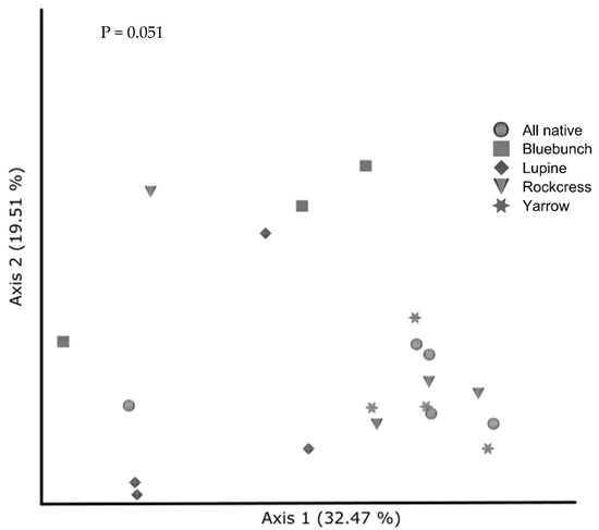 Native study samples were analyzed using the q2 diversity core-metrics-phylogenetic plugin. First, the ASV table containing all samples was filtered to contain only native samples. A sampling depth of 3316 was chosen based on sample B3-3 (silky lupine) because it excluded only three samples while maximizing the sampling depth. Weighted UniFrac dissimilarity [73] was used to create a distance matrix and beta diversity results were viewed via Principal Coordinates Analysis (PCoA).