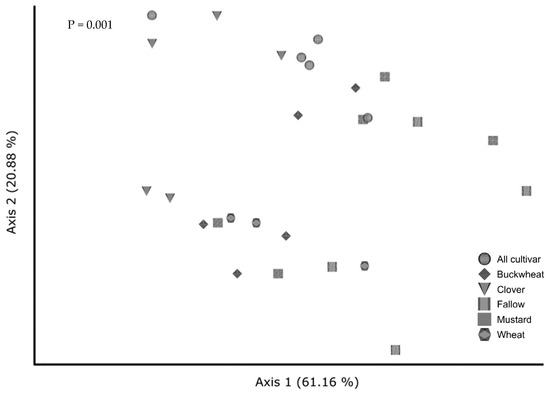 Principal coordinates analysis of fungal communities from cultivar cover crops visualized by Robust Aitchison distance. Treatments are all plants grown together (“All cultivar”), buckwheat (“buckwheat”), crimson clover (“Clover”), uninoculated fallow (“Fallow”), white mustard (“Mustard”), and wheatgrass (“Wheat”)m with the following significant pairwise interactions: All cultivar and Fallow (p = 0.005, q = 0.045), All cultivar and wheatgrass (p = 0.017, q = 0.084), Clover and Fallow (p = 0.006, q = 0.045), clover and mustard (p = 0.025, q = 0.084), clover and wheatgrass (p = 0.037, q = 0.092).