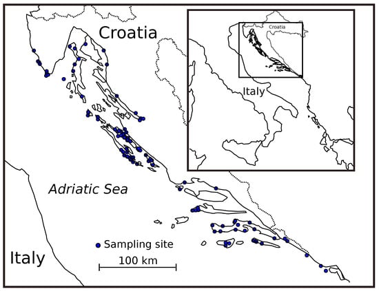 We performed a total of 19,678 lure-assisted, visual-census, field transects at 149 outer coast study sites in Croatia, for an average of 132 transects per site. Sampling was performed between May and October 2009 to 2015, during maximal occurrence of many Mediterranean littoral fish species including within Cymodocea nodosa seagrass meadows [,,]. The sites were chosen to span the N-S and E-W range of the Croatian coast (north to central Adriatic), and to include both mainland and island locations, for a total of 18 inner and outer islands (Figure 1).
