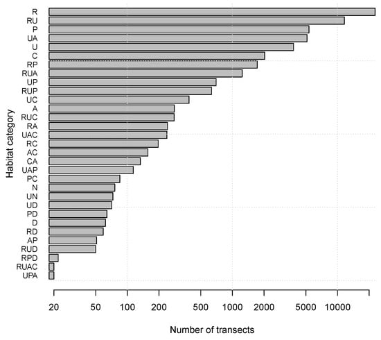 The total number of transects with the indicated benthic habitats present. U: unconsolidated sediment. R: rock. A: macroalgae (usually Cystoseira spp.). P: seagrass Posidonia oceanica. C: seagrass Cymodocea nodosa. Shown are the 30 most common habitat combinations out of a total of 50. Horizontal axis uses a log scale to show relative sizes of the bars more clearly.