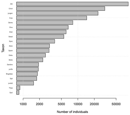 The total number of individuals recorded for each of the 20 most abundant taxa. See Table names for Latin binomials.