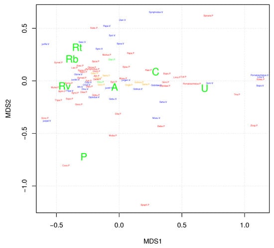NMDS ordination of taxon relative habitat abundance. Red: piscivorous predators greater than 5 cm in length. Blue: prey taxa, all individuals under 5 cm in length. Orange: aggressive predators, wait-chasers. Green: aggressive predators, cruise-chasers. See Table 2 for Latin binomials. Rb, Rt, Rv: bare rock, rock covered with algal turf, and rock covered with macroalgae respectively. U: unconsolidated sediment. A: macroalgae (usually Cystoseira spp.). P: seagrass Posidonia oceanica. C: seagrass Cymodocea nodosa.