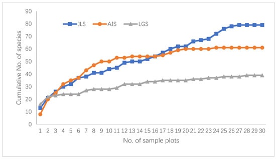 Overall, we recorded a total of 4 subclasses, 9 orders, 20 families, 50 genera, and 99 species of ferns, as well as 9759 individual ferns (Table S1; Figure S1). The sample coverage curves of the ferns at three sites indicated that all sampling efforts were sufficient as they began to level off at the 26th, 19th, and 15th plot (i.e., 650 m2, 475 m2, and 375 m2) for JLS, AJS, and LGS, respectively (Figure 2).