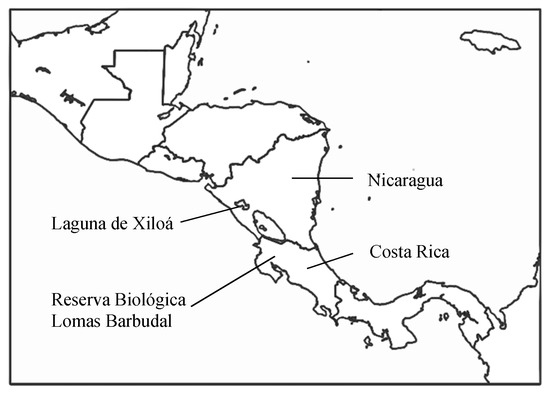 Map of Central America indicating the location of Lomas Barbudal Biological Reserve and Laguna de Xiloá.