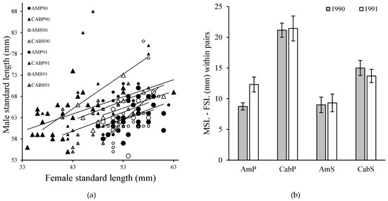 (a) Male standard length (mm) versus female standard length in mated pairs of convict cichlids by 1990 and 1991 in the pool (P) and stream (S) habitat in Río Cabuyo and Quebrada Amores. Large males monopolize spawning sites and large females produce larger clutches leading to size-assortative mating. (b) Overall mean ± SE length difference within a pair was 13.78 ± 0.59 mm (n = 149), and intrapair difference differed significantly by site (F3,145 = 44.25, p < 0.001). Small females were not found spawning in Quebrada Amores as often as they occurred in Río Cabuyo. Data from [10].