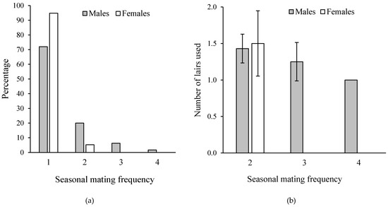 (a) Seasonal mating frequency (Dec–May) for males and females for all sites combined. 28% of males spawned more than once, 5% of females spawned more than once. (b) Mean ± SE number of spawning lairs used as a function of seasonal mating frequency. Males often reused the same site for sequential broods. Data from [11].