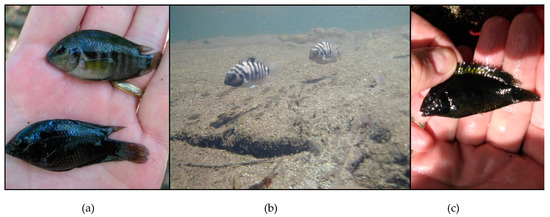 - Wisenden, B.D. Factors affecting reproductive success of convict cichlids in Costa Rican streams. Can. J. Zool. 1994, 72, 2177–2185. [Google Scholar] [CrossRef]