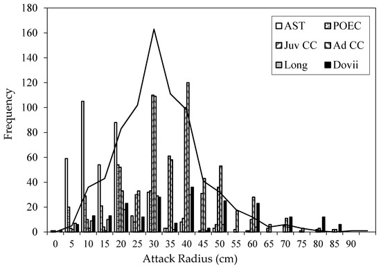 Parental brood defense attacks per 10 min observation period (n = 840 trials) against the characin Astyanax fasciatus (AST), Poecilia gillii (POEC), juvenile convict cichlids (Juv CC), adult convict cichlids (Ad CC), sand-sifter cichlid Cribroheros longimanus (Long), or juveniles of the piscivore Parachromis dovii (Dovii). Line represents overall frequency distribution of parental attacks against brood predators. Data from [10,17].