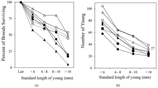 (a) Percentage of broods surviving at various intervals between emergence from the lair until independence from parental care after the young reach 10 mm SL. (b) Number of young in broods at these same intervals for each site. Although there were site differences in brood size initially, all site-years converged on an average of 27 fry at independence. Solid symbols, pool habitat; open symbols, stream habitat. Circles, Río Cabuyo; triangles, Quebrada Amores. Solid lines, 1990; dashed lines, 1991. Data from [9].