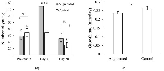 (a) Lack’s hypothesis is that maximum brood size is limited by the number of offspring that can be reared to independence, not by the physiological capacity to produce eggs. Naturally-occurring broods in the Río Cabuyo were either left unmanipulated (control) or augmented with extra fry to have 150 young. Experimental broods were unable to sustain numerical advantage of the manipulation by the end of 20 days. (b) Individual growth rates of larvae in experimental broods were significantly lower than larvae in control broods due to crowding within the parentally-defended area and therefore experienced increased competition for food. * p < 0.05, *** p < 0.001. Data from [18].
