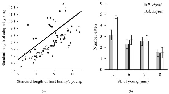 (a) Size-biased conspecific adoption of broods from neighboring families. Line is y = x. When young are adopted from neighboring families, parents accept young that are smaller than their own and reject those that are larger than their own (data not shown), until the host young are larger than 8 mm SL. This raised the possibility that adopted young are being set up as targets for predators to spare predation on host young, which was confirmed in a subsequent field experiment. (b) Hunting success of juvenile convict cichlids and juvenile P. dovii on groups of convict cichlid fry of mixed sizes. Small fry were eaten significantly more often than large fry. Data from [18].