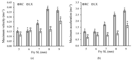 (a) Maximum velocity (m·s−1) and (b) acceleration (m·s−2) for cichlid fry of lengths 5 to 9 mm SL, from parents from Río Cabuyo (RC) in Costa Rica and from Laguna de Xiloá (LX) in Nicaragua. Letters above bars indicate post-hoc pairwise comparison tests across fry sizes within each site. Data from [17,21].