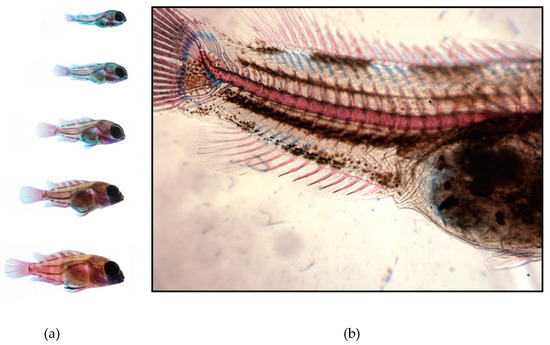 (a) Cleared and stained larvae and juveniles with alcian blue (cartilage) and alizarin red (bone) for Río Cabuyo fish sized 5–9 mm SL. (b) Each specimen was imaged at high magnification so that each of 111 skeletal elements could be scored for degree of ossification on a scale of 1–4. Photos by Tony Stumbo. Data from [17].
