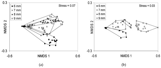 (a) Non-metric dimensional scaling (NMDS) axes for 111 bones × 125 larvae from Río Cabuyo. There was no variation in 5 mm fry (not shown). Pairwise comparisons revealed that ossification of 6 mm fry < 7 = 8 = 9 mm SL fry. (b) NMDS ordination of images from larvae from lab-F1 adults from Laguna de Xiloá. Again 5 mm SL fish contained no variation (not shown), but the conspicuous shift in ossification was between 8 mm fry and 9 mm fry. Data from [17,21].