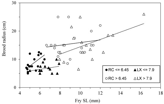 The radius of broods being guarded in Río Cabuyo (circles) and Laguna de Xiloá (triangles) from time of early emergence from the spawning lair to the point of independence from parental care. Change-point analysis revealed nonlinearity occurred at SL = 6.45 in Río Cabuyo fish and SL = 7.9 for fish in Laguna de Xiloá. These switch points coincide with changes in skeletal ossification or the young, ontogenetic shifts in swimming performance and changes in parental adoption behavior. Data from [21].
