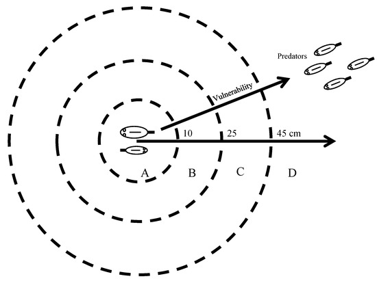 Geometry of brood defense in convict cichlids in Río Cabuyo that incorporates data on parental attack distances, brood radius data and the trade-off for fry between maximizing foraging while minimizing risk of predation. A, zone of intimidation where physical presence of parents deters approach of brood predators. Very small fry from Río Cabuyo stay here and small and medium-sized fry from Laguna de Xiloá stay here; B, transition zone where fry can expand into when their swimming performance and predation risk warrants it; C, zone of interception to maintain a predator-free buffer around the brood; D, zone of escalated attack, particularly for juveniles of the piscivore P. dovii. The evolution of parental care in cichlids is a three-way process between brood predators, ontogeny of antipredator competence in the fry, and parental area defense.