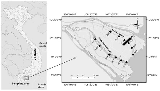 Sampling was carried out in the Ba Lai (BL) and Ham Luong (HL) estuaries, during the dry season in March 2017. In each estuary, 6 subtidal stations were identified from the mouth to the upstream. Within the Ba Lai estuary, BL1, BL2, and BL3 (BL1-BL3) are the downstream stations, while BL4, BL5 and BL6 are located upstream of the dam. In the Ham Luong estuary, HL1, HL2, HL3, HL4, HL5, and HL6 are reference stations situated at similar positions along the original estuarine gradient as in the Ba Lai. The sampling area is shown in Figure 1.
