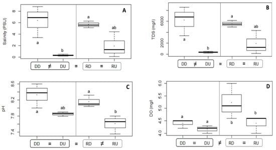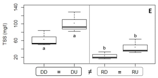 Box and whisker plots and mean values (.) for salinity (A) and TDS (B), pH (C), DO (D) and TSS (E) in the water column of the estuarine sections. ▢ point to estuary level. Abbreviations: “DD” = dammed downstream, “DU” = dammed upstream, “RD” = reference downstream, “RU” = reference upstream. Letters a and b pointed to significant differences. “≠” sign indicated the significant differences between 2 estuaries or/and estuarine sections within an estuary, while “=” sign meant that no significant difference was found.