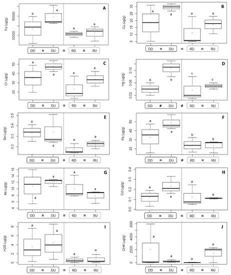 Box and whisker plots and mean values (.) for heavy metals including Fe (A), Cu (B), Cr (C), Hg (D), Se (E), Pb (F), As (G), Cd (H), H2S (I) and CH4 (J) concentration in sediment of the estuarine sections. ▢ point to estuary level. Abbreviations: “DD” = dammed downstream, “DU” = dammed upstream, “RD” = reference downstream, “RU” = reference upstream. Letters a, b and c refer to significant differences. “≠” sign indicated for the significant differences between 2 estuaries or/and estuarine sections within an estuary, while “=” sign meant that no significant difference was found.