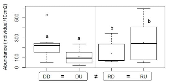 Box and whisker plots and mean values (.) for nematode densities of the estuarine sections. ▢ point to estuary level. Abbreviations: “DD” = dammed downstream, “DU” = dammed upstream, “RD” = reference downstream, “RU” = reference upstream. Letters a and b pointed to significant differences. “≠” sign indicated for the significant differences between 2 estuaries, while “=” sign meant that no significant difference was found.