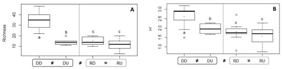 The genus richness was highly variable in Ba Lai, with DD containing twice as many genera per sample (35) as DU (14). In Ham Luong, richness was less fluctuating between the two sections, with 15 and 12 genera encountered in RD and RU samples, respectively (Figure 5A). The two-way ANOVA based on richness, followed by a pairwise comparison analysis, showed a significant interaction effect, with significant differences between the pairs DD&DU, DD&RD and DD&RU.