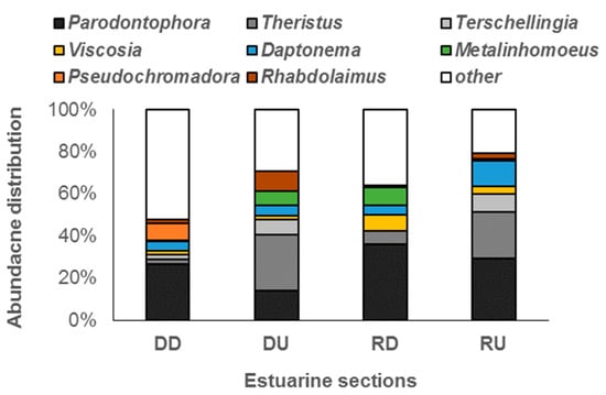 The eight most abundant genera in each estuarine section are shown in Figure 6. Parodontophora was the dominant genus and contributed more than 26% to the total community in DD, RD and RU, whereas in DU, Theristus was the most abundant genus (26.78%), with a relative abundance which was twice as high that of Parodontophora (13.96%). Theristus and Terschellingia were present in higher percentages in the upstream parts, especially in the DU section of Ba Lai. Parodontophora, nevertheless, was found to be more abundant in the downstream sections. Especially within Ba Lai, in DD Parodontophora was twice as abundant as in DU.