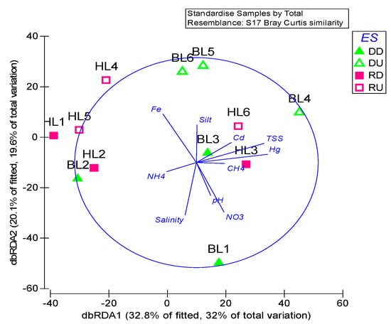The dbRDA plot on the correlation between nematode generic composition on abundance with environment variables for all stations of estuarine sections. Abbreviations: (Es: estuarine-section), “DD” = dammed downstream, “DU” = dammed upstream, “RD” = reference downstream, “RU” = reference upstream.
