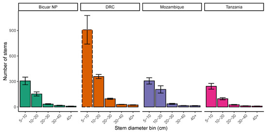 Ranked variation between plots in stem number within each site, with bars according to stem diameter class. Error bars are the mean ± 1 standard error. The dashed bar for the DRC 5–10 cm stem diameter class indicates that these measurements were estimated by extrapolating a linear regression of log stem abundance across the available stem diameter classes for DRC.