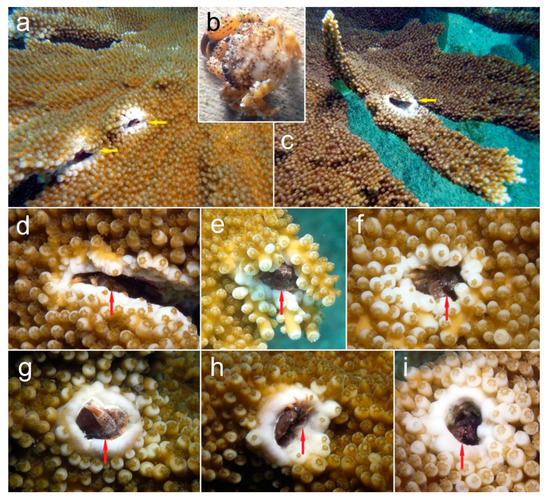 Acropora palmata at <2 m depth, Blue Wall dive site (2015), Curaçao (12°08’06’’ N, 68°59’16’’ W), hosting Domecia acanthophora: (a,c) branches with crab pits; (b) a crab taken from a pit; (d–e) crab dwellings at the margin of a coral branch; and (f–i) crab pits away from the branch margin, showing a white collar. Yellow arrows: crab dwellings; red arrows: Crabs.