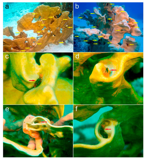 Millepora complanata at 2–3 m depth, Klein Bonaire (2019), hosting Domecia acanthophora: (a,c–f) Carl’s Hill dive site (12°09’53’’ N 68°19’23’’ W); (b) Monte’s Divi dive site (12°09’01’’ N 68°18’55’’ W); (c) crab inside narrow crevice; and (d–f) crabs inside pits consisting of folds at the upper margin of foliaceous coral branches. Yellow arrows: crab dwellings; red arrows: crabs.