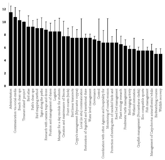 The mean magnitude scores for each attribute calculated for each management action are shown in Figure 1. In our case study of ordinary management of a protected area, we observed a significant difference among management actions (χ2 = 83.186, p < 0.001; d.f. 34, Friedman test) with administration, communication, and beach clean ups being the actions demanding the most effort (mean magnitude > 10) and bird-watching courses and wildlife rehabilitation being the actions demanding the least effort (≤ 5) (Table 2).